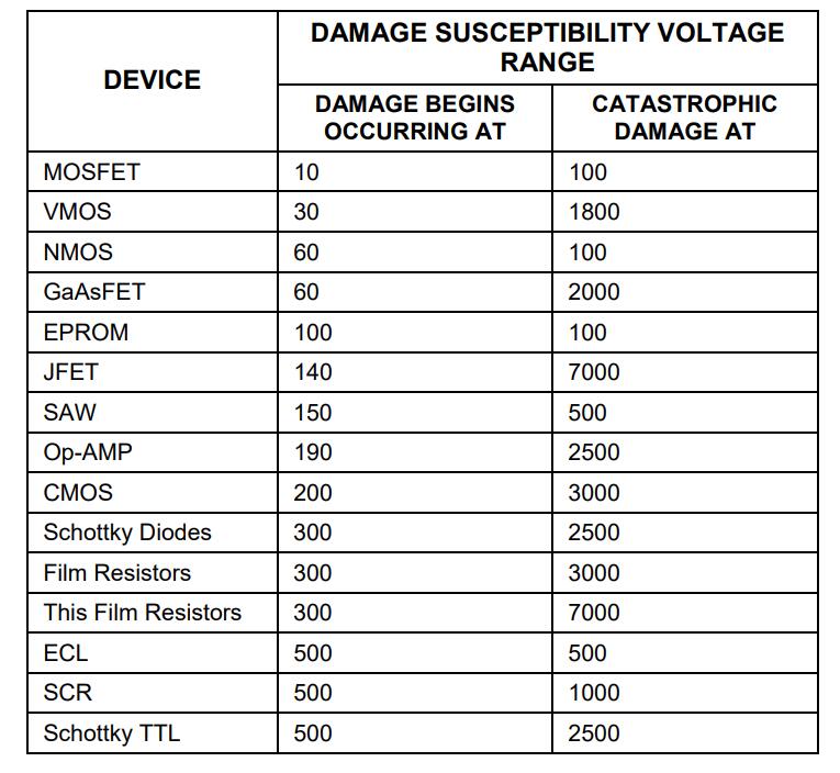 將表中的值進行快速比較,列出了檢測儀器件的敏感性水平,這說明了為什么《半導體可靠性新聞》估計大約 60% 的器件故障是由靜電損壞造成的釋放。